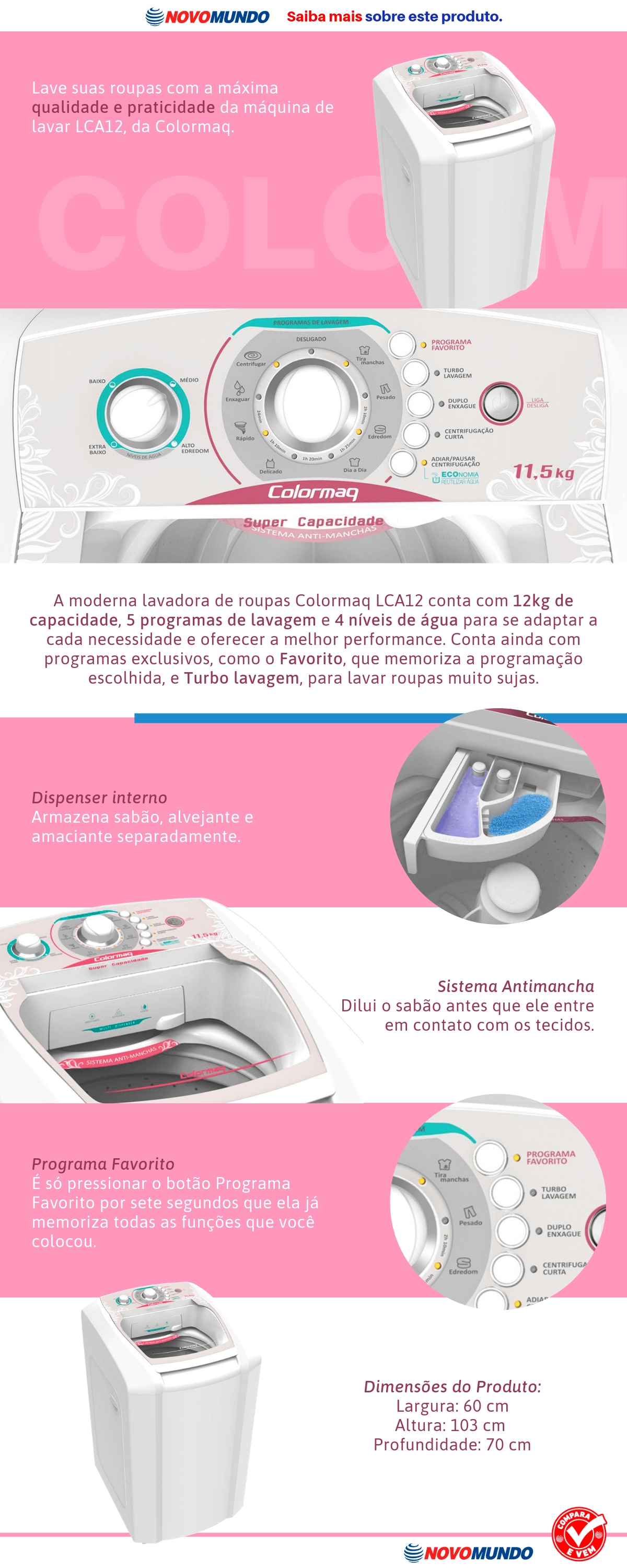 A moderna lavadora de roupas Colormaq LCA12 conta com 12kg de capacidade, 5 programas de lavagem e 4 níveis de água para se adaptar a cada necessidade e oferecer a melhor performance. Conta ainda com programas exclusivos, como o Favorito, que memoriza a programação escolhida, e Turbo Lavagem, para lavar roupas muito sujas. Para completar, essa lavadora conta com classificação energética A e função Reutilizar Água, que te ajudam a economizar nas contas de água e luz.Confira alguns diferenciais da LCA12: